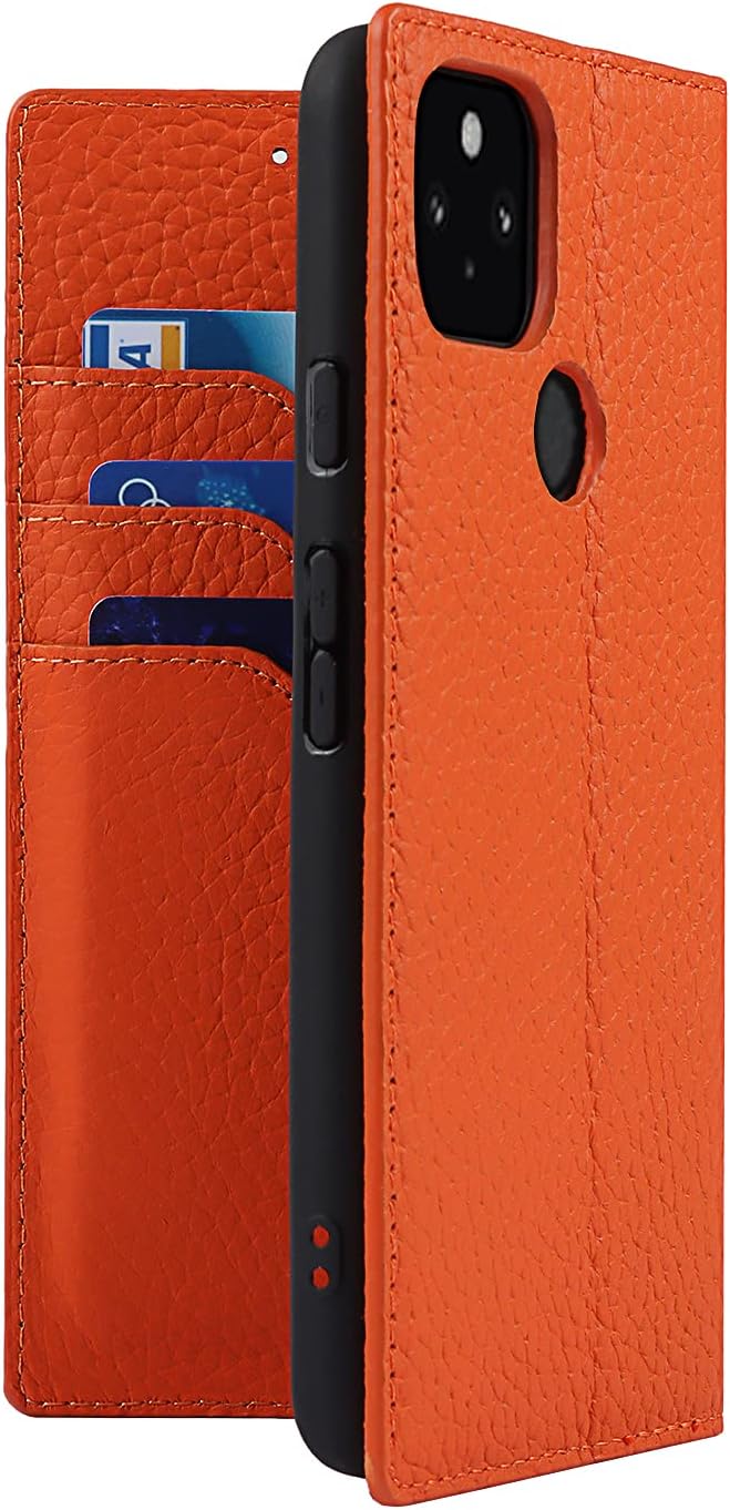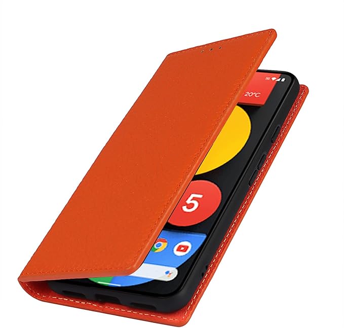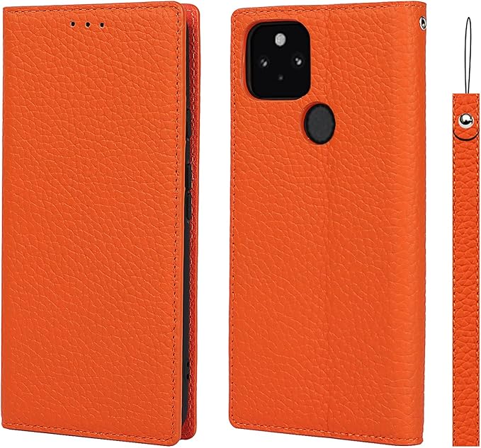 for Google Pixel 5A 5G ケース 本革 本革 for pixel5a 5g 手帳型ケース 財布型 カバー 手帳式 本革 柔らかい 本皮 スプラットホール付き スプラット同梱 内蔵マグネットカード収納 横置きスタンド機能 - オレンジ