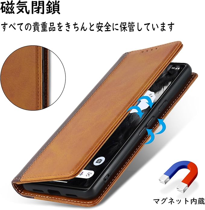 【収納機能】Google Pixel 7aケース内側には三つのカード入れとフリーポケットがつき、カード類や紙幣、名刺などが収納できます。カードスロットに2枚のカードを入れると、内蔵マグネットの機能を最大限に発揮し、カードが消磁されるのを防ぐことができます。横置きスタンド機能が付き、横向いて斜めに立てて、自由に角度を調整して、お好みの角度で動画鑑賞や読書などを楽しめます。長時間での新幹線、飛行機の中での暇つぶしに最適です。