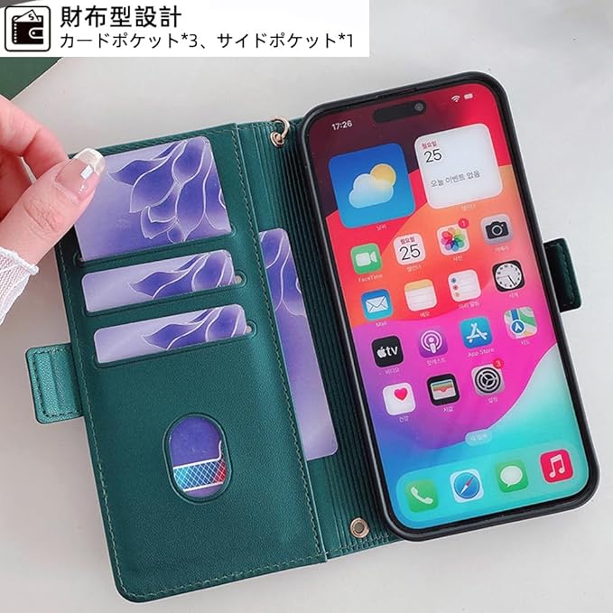【機能性4:カード収納と安全保護】窓口式のカードスロットとサイドポケットも装備しております。ちょっとした外出する際に、財布が無くても手帳型ケースだけで十分です。内蔵マグネットの留め具なのでピタッと閉まります。クレジットカードなどの情報漏洩を防ぐために、カード入れの内側にRFID自動遮断の素材を採用します、無接触なプライバシー盗難から個人情報を防衛します。ご注意:電磁波を遮蔽する素材なので、カードをいれたままの読み取りはできません。
