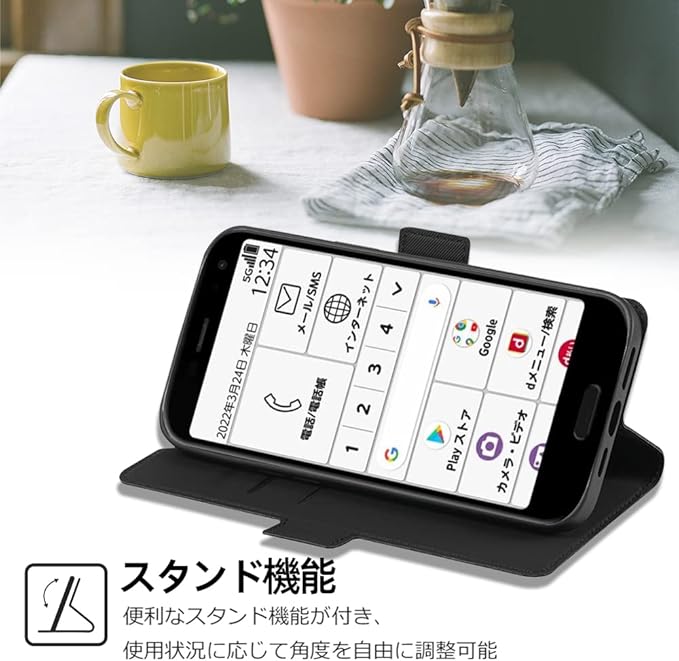 【特徴2】:スマホを横置きにしての視聴は不可欠なので、本ケースはスタンド機能が付きます。横向いて斜めに立てて両手を解放し、お気軽に読書やビデオの観賞を楽しむことができます。