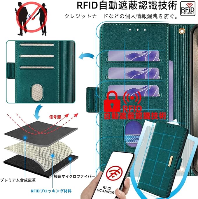 【機能性4:カード収納と安全保護】窓口式のカードスロットとサイドポケットも装備しております。ちょっとした外出する際に、財布が無くても手帳型ケースだけで十分です。内蔵マグネットの留め具なのでピタッと閉まります。クレジットカードなどの情報漏洩を防ぐために、カード入れの内側にRFID自動遮断の素材を採用します、無接触なプライバシー盗難から個人情報を防衛します。ご注意:電磁波を遮蔽する素材なので、カードをいれたままの読み取りはできません。