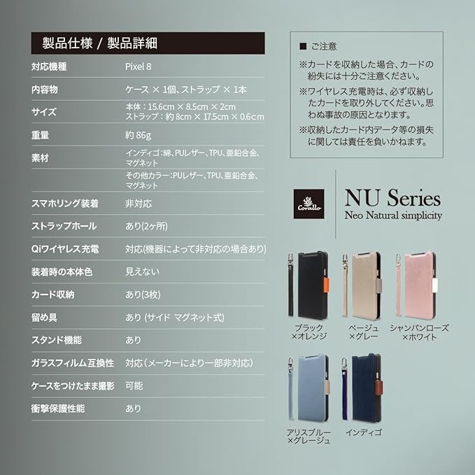 【製品仕様】… ◆ 対応機種 : Google Pixel8a グーグル ピクセル8a ◆ 内容物 : ケース 1個、ストラップ 1本 ◆ サイズ : 約 15.8cm 8.5cm 2cm ◆ 重量 : 約 86g ◆ 素材 : インディゴ:綿、PUレザー、TPU、亜鉛合金、マグネット その他カラー:PUレザー、TPU、亜鉛合金、マグネット
