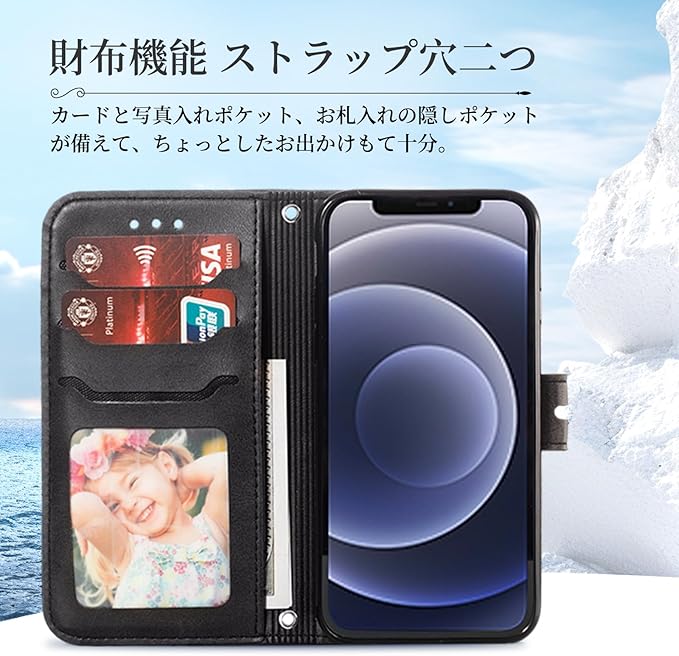 【功能 &機能性 4in1】①横置きスタンド機能:動画視聴でも手に持つ必要がなく、超楽々動画視聴が可能です;②財布型:ケースの裏側に3つのカードポケットとお札入れのフリーポケット一つあり、ショップでのポイントカード、交通機関でのスムーズな移動をサポートでき、 SUICA / PASMO / ポイントカード / メモ 等収納でき、ちょっととしたお出かけてもこれで十分です;③ベルトマグネット内蔵 、カバンの中で、自動的に開けないので、きちんとカードを保護し、片手でも簡単操作できる;④ストラップを付ける穴が3つあり、上下に各一つ、それにインナーケースの右下にも一つ穴あり、お好きなストラップとタッセルとかを使用でき、生活にもっと便利になり、または各種ボタンの使用、カメラ撮影、スピーカーホール等、すべての機能もそのまま立て掛けて稼働します。