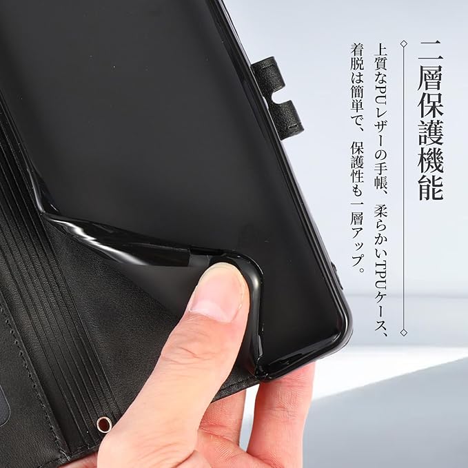 【素材:高級PUレザーとアップグレードしたTPUケース】本製品は厳選されたPUレザーを採用し、エンボスの猫柄が特徴です。レザー自体が水分をはずみ、汚れやシミが付きにくい仕様です。肌触りのような感じで、手汗が出てきても滑りにくいです。インナーケースは弾力あるTPU製で、ケースの一番右したのところにストラップホールもあり、お好きな小物とかお付けられます。柔らかく耐衝撃が強くなり、着脱もスムーズで、不意な落下からスマホをしっかりお守れます。