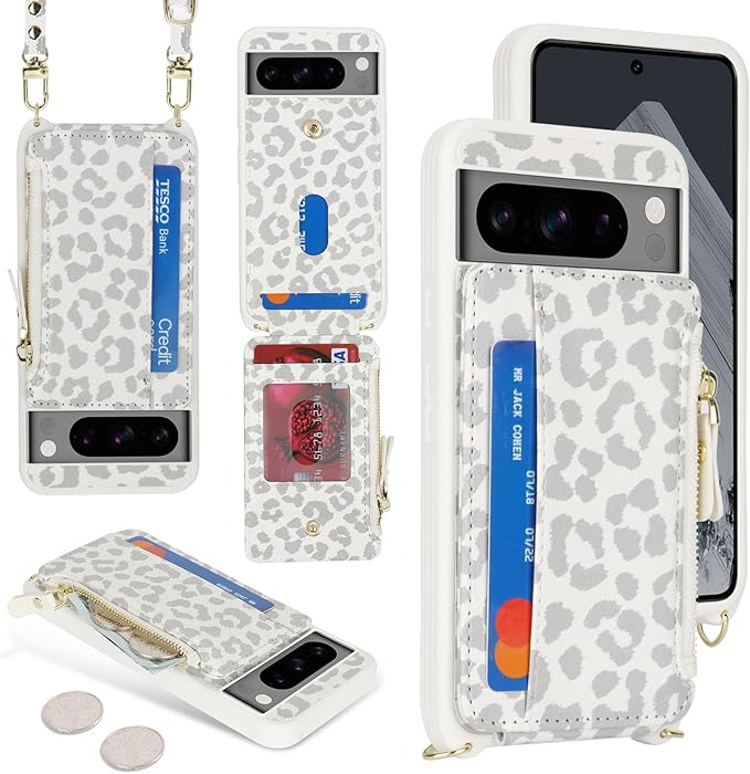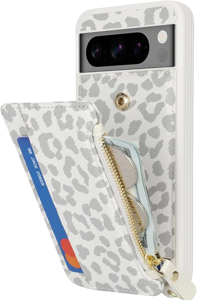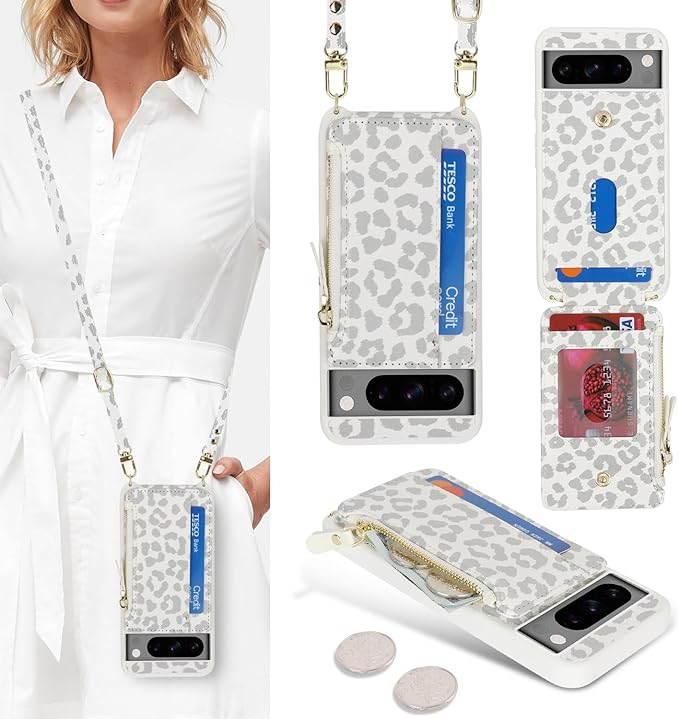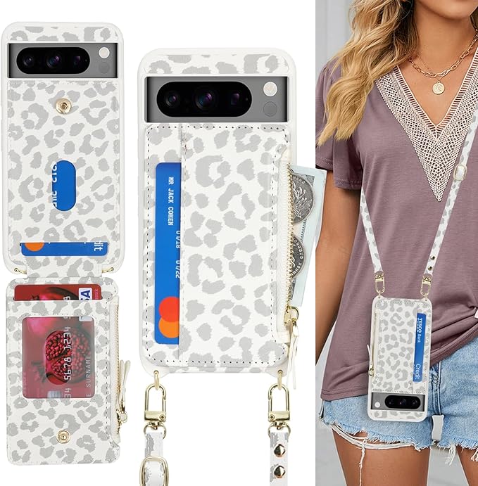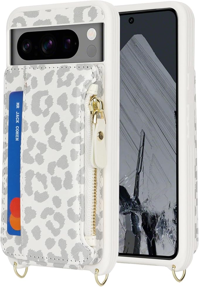 for Google Pixel 8 Pro ケース for Pixel 8Pro ショルダー リング付き 手帳型 上下開 for Pixel8 Pro CASE カバーSunYoo カード収納 横置き スタント肩がけ 首掛け 斜め掛け ファスナー ストラップ付き ショルダーケース 豹柄 ヒョウ柄 ホワイト | KAZESHOP