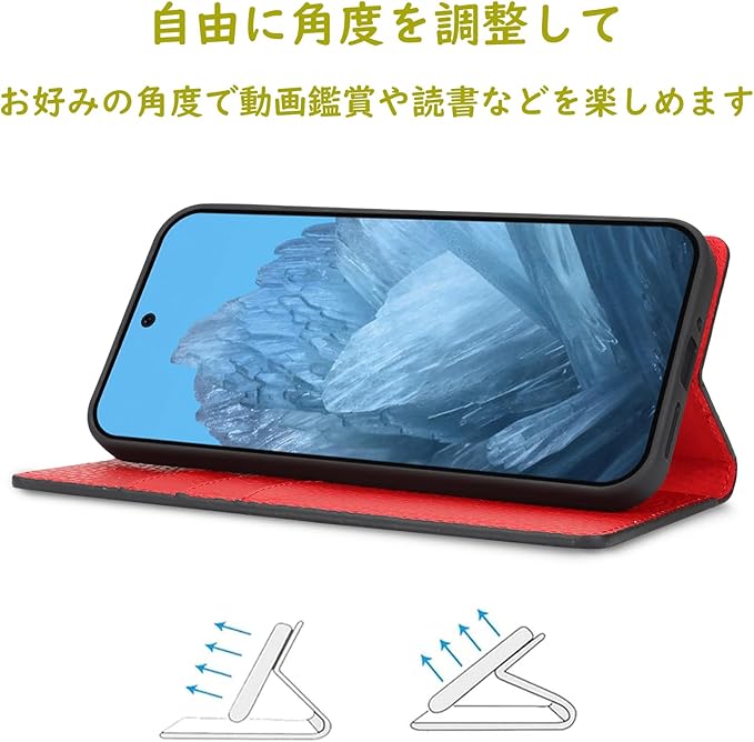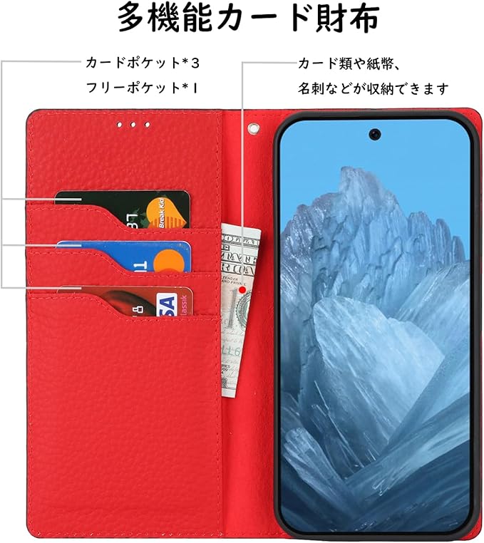 【収納】Google Pixel 9 / 9 Proケース内側に実用性のカード入れポケット 3、内側ポケット 1、カード類、現金、名刺、免許証入れなどを収納でき、通勤も通学にも楽々タイプです。カードスロットに2枚のカードを入れると、内蔵マグネットの機能を最大限に発揮し、カードが消磁されるのを防ぐことができます。横置きスタンド機能が付きまして、好きな角度を調節です。映画を見たり読んだりすることで手を解放できます。