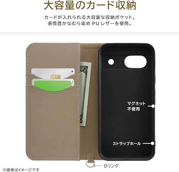 洗練された大人の手帳型ケース 風合いを楽しむムラ染めPUレザー 柔らかな質感 / ケースを付けたままカメラ撮影可能 / カメラ穴 くり抜き カメラ / ケースをつけたまま撮影できる 撮影可能 カメラ撮影に便利 / 収納ポケット付き / レシートなども入れられる大きめの収納ポケット付き / カードポケット 大容量 2枚 3枚 4枚 / ICカード カードケース ポイントカード