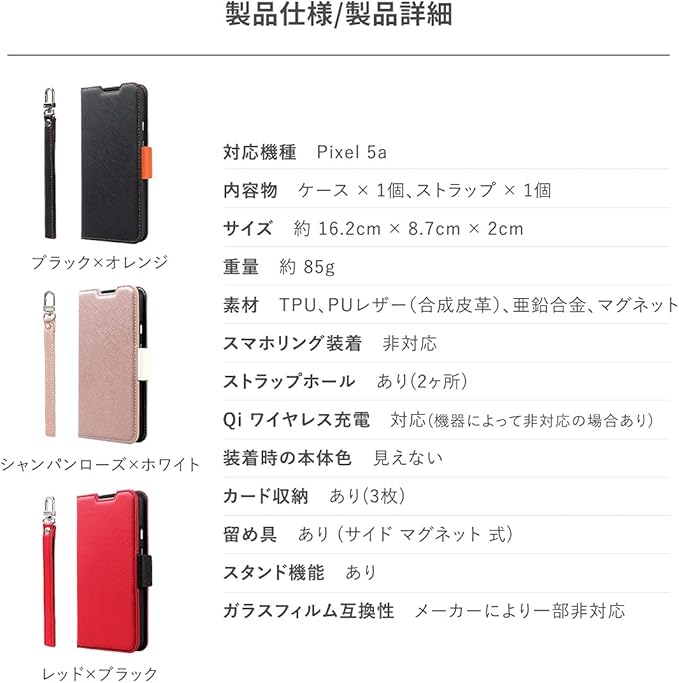 【製品仕様】… ◆ 対応機種 : Google Pixel 5a ( グーグル ピクセル 5a ) ◆ 内容物 : ケース 1個、ストラップ 1個 ◆ サイズ : 約 16.2cm 8.7cm 2cm ◆ 重量 : 約 85g ◆ 素材 : TPU、PUレザー(合成皮革)、亜鉛合金、マグネット ◆ 型番 : CR_P5ACSPLNU_BO