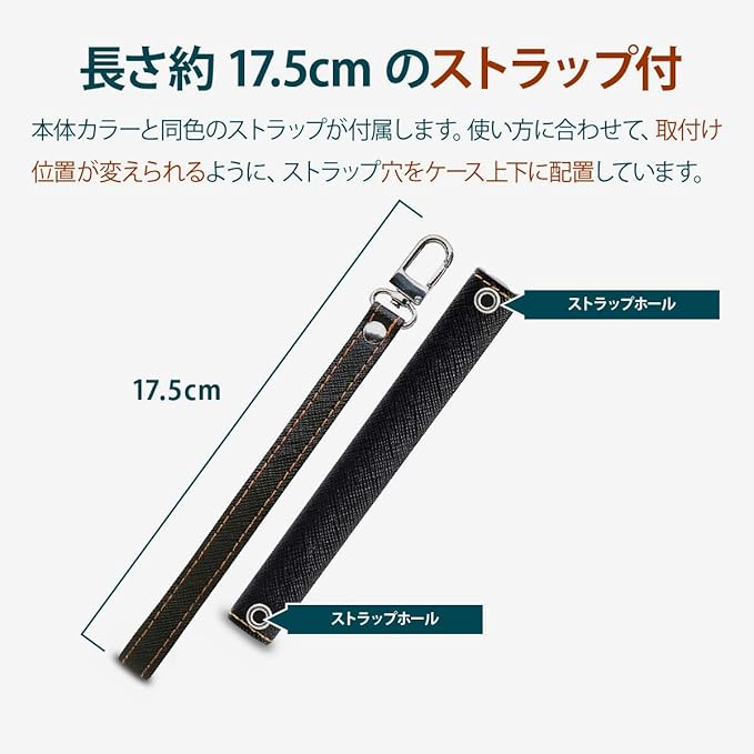 本体カラーと同色のストラップを付属しております。位置を変えられるようストラップ穴をケース上下に配置しております。