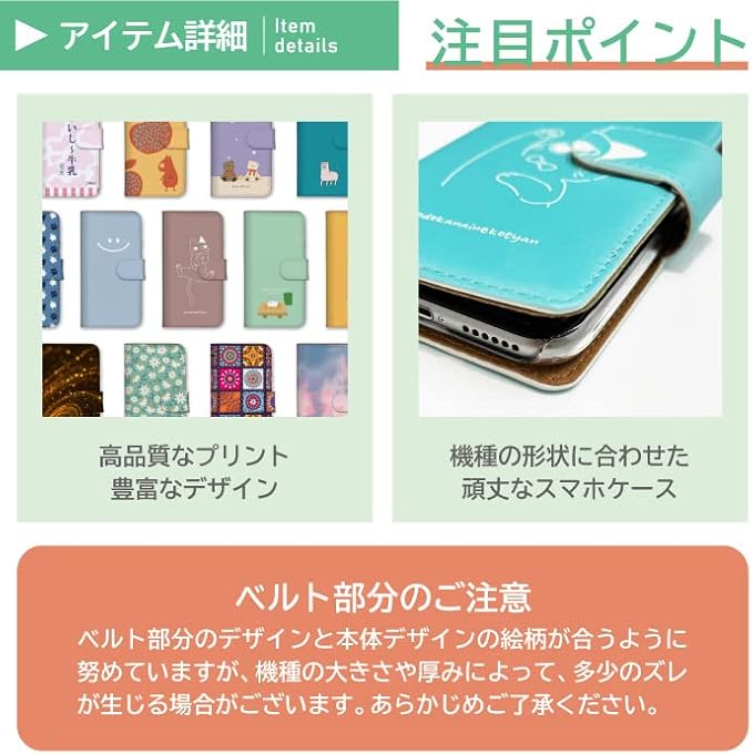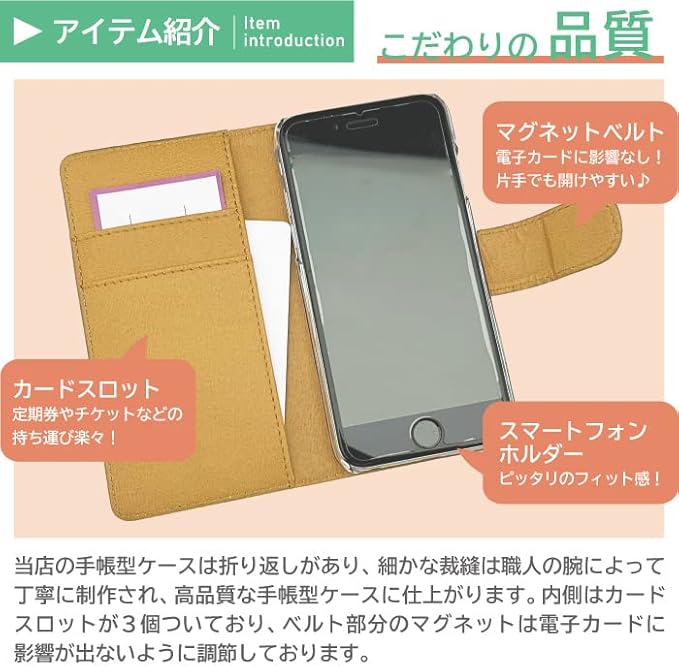 商品画像にはiPhone用のものを参考に掲載しておりますが、ご選択いただいた機種に合わせてカメラホールなどが空いております。また、指紋認証がある機種の場合は、指紋認証センサー用の穴も空いておりますので、ケースに装着したまま各機能をお使いいただけます。本体を貼り付けるタイプではなく、手帳の中のハードケースに装着するタイプでございます。内側にはカード収納ポケットが3つございまして、マグネット付きのベルトで手帳を閉じて固定できるようになっております。また、スタンド機能がございますので、動画などの視聴にも便利なカバーとなっております。手帳型スマホケースはハードケースとは違い画面も保護することができるので、耐衝撃性能に優れており、スマートフォンをしっかり保護したい方には大変おすすめです。