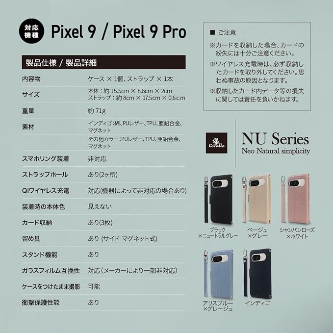 【製品仕様】… ◆ 対応機種 : Google Pixel9 Pixel 9 Pro ( グーグル ピクセル9 グーグルピクセル9 プロ ) ◆ 内容物 : ケース 1個、ストラップ 1本 ◆ サイズ : 約 15.5cm 8.6cm 2cm ◆ 重量 : 約 71g ◆ 素材 : インディゴ:綿、PUレザー、TPU、亜鉛合金、マグネット その他カラー:PUレザー、TPU、亜鉛合金、マグネット