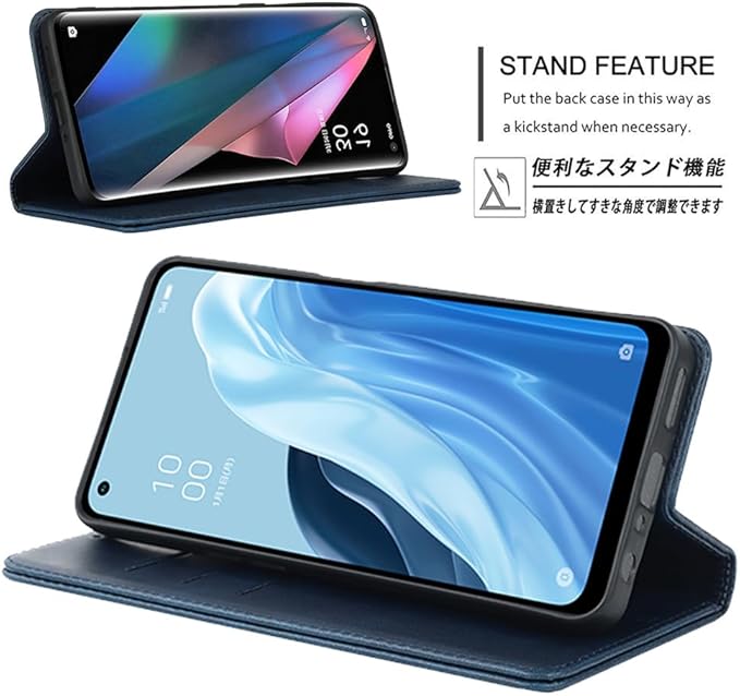 【特徴2】:スマホを横置きにしての視聴は不可欠なので、本ケースはスタンド機能が付きます。横向いて斜めに立てて両手を解放し、お気軽に読書やビデオの観賞を楽しむことができます。