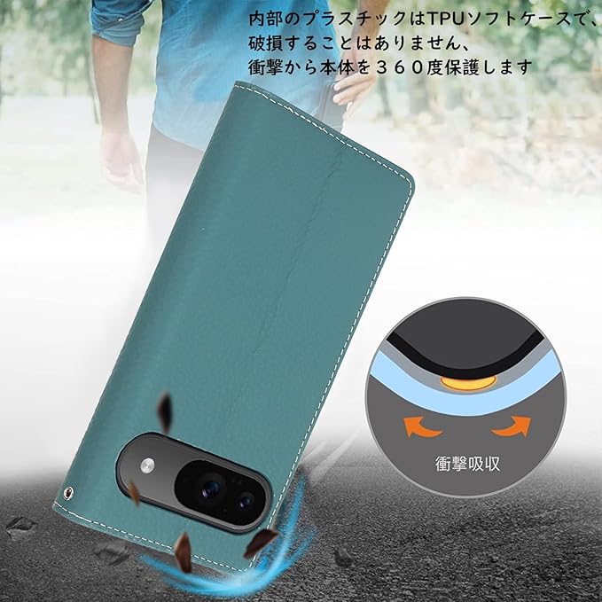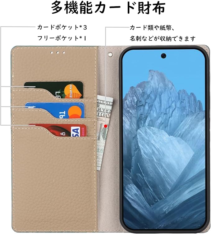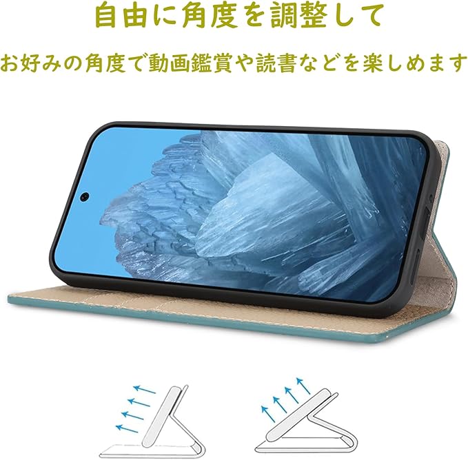 【収納】Google Pixel 9 / 9 Proケース内側に実用性のカード入れポケット 3、内側ポケット 1、カード類、現金、名刺、免許証入れなどを収納でき、通勤も通学にも楽々タイプです。カードスロットに2枚のカードを入れると、内蔵マグネットの機能を最大限に発揮し、カードが消磁されるのを防ぐことができます。横置きスタンド機能が付きまして、好きな角度を調節です。映画を見たり読んだりすることで手を解放できます。