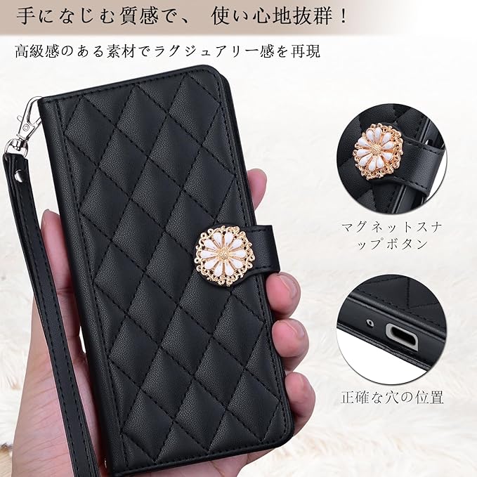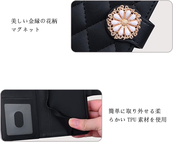 1.携帯電話の機種との互換性:ご購入前に、選択した携帯電話の機種との互換性をご確認ください。 2.衝撃保護:ケースは非常に柔らかく、表面よりもわずかに高い位置にエッジがあるため、携帯電話や電子機器のディスプレイや背面を衝撃による損傷から守ります。3.繊細なデザイン:この財布型スマホケースは、前面にダイヤモンド格子の刺繍デザインが施され、マグネット吸収式の留め具には繊細な花柄があしらわれています。現金やクレジットカード用のカードスロットが3つ内蔵されているので、財布を持ち歩く必要がありません。 4.携帯電話スタンド:ケースは折りたたむことができ、いつでもどこでも便利に使用でき、様々な機能的な操作を簡単に実現できます。