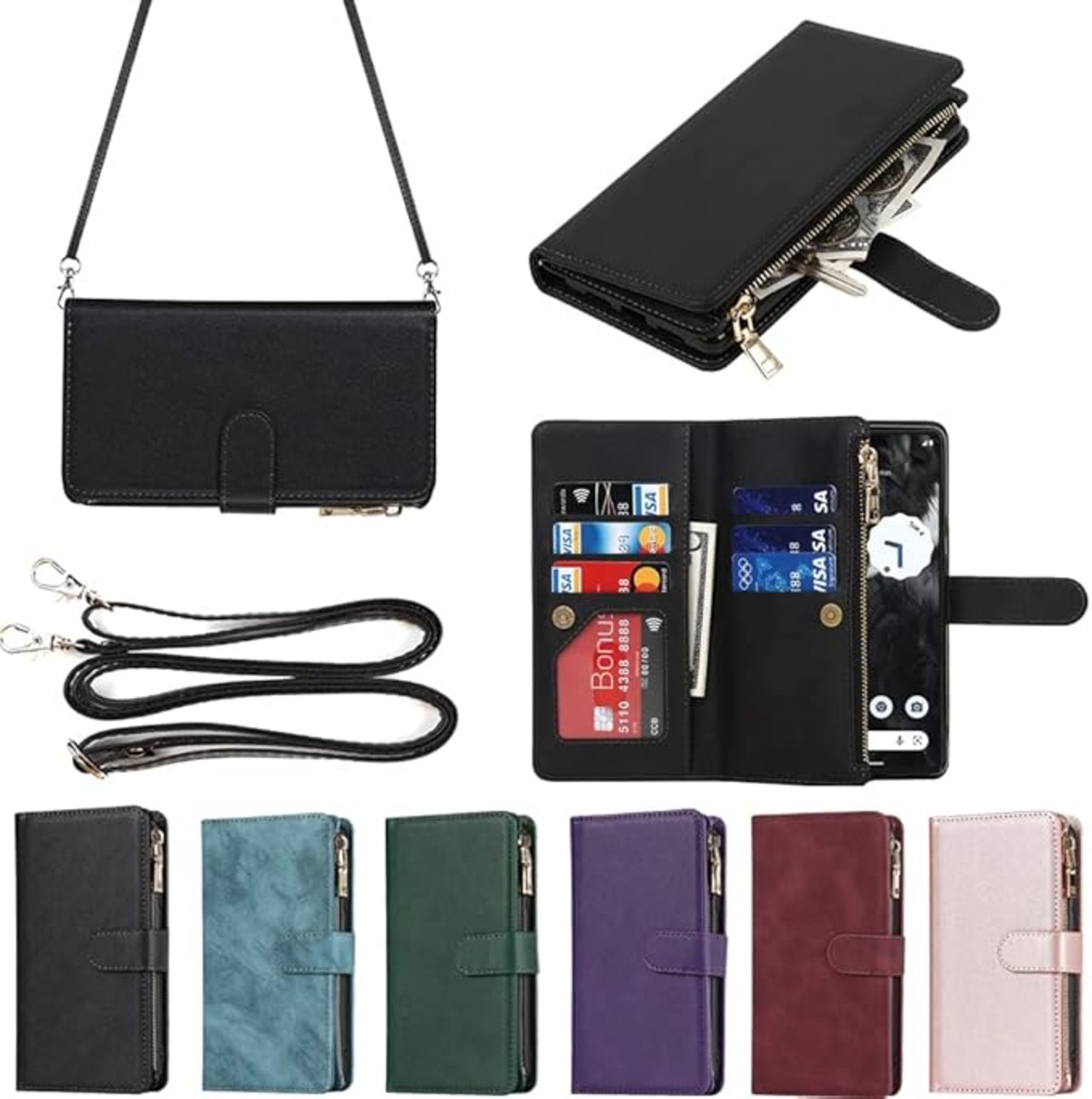 for Google Pixel 7A ケース for pixel 7a google 縄掛けケース Pixle7A 手帳型 財布型 ICカード コインポケット ストラップ付き カード 収納 小銭入れ ファスナーポケット付き PUレザー 6色ブラック