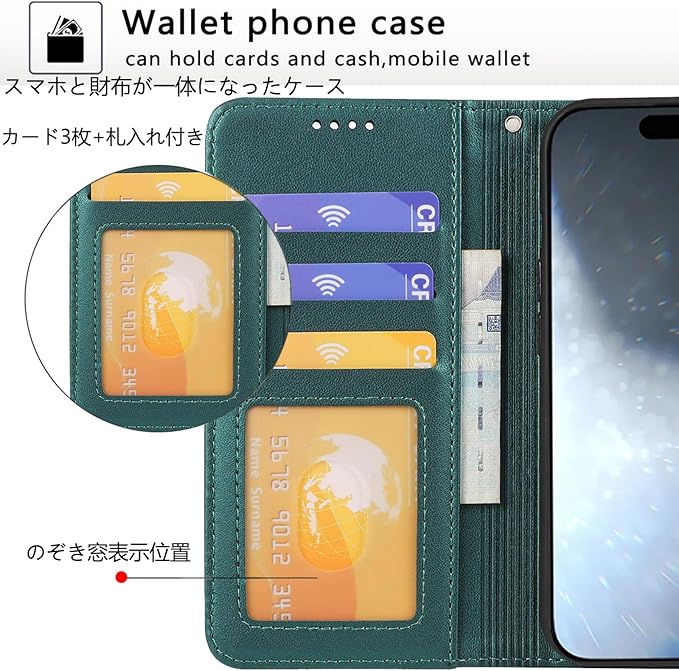 【カード収納&マグネット式】:窓ソケット+サイドポケットでカード最大3枚を収納可能。磁石をフープの留め具部分に配置することで、カードへの磁気影響を低減、ケースの閉じ付け力を強化。