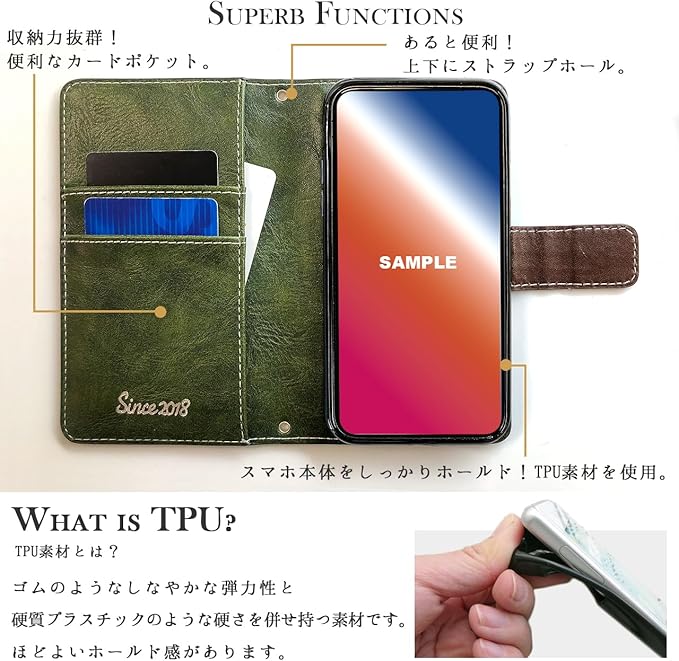 【全面保護】手帳型の全面保護機能でディスプレイ、背面をしっかり保護します。さらにカメラレンズ保護構造でスマホ本体を傷から360度しっかり保護してくれます。