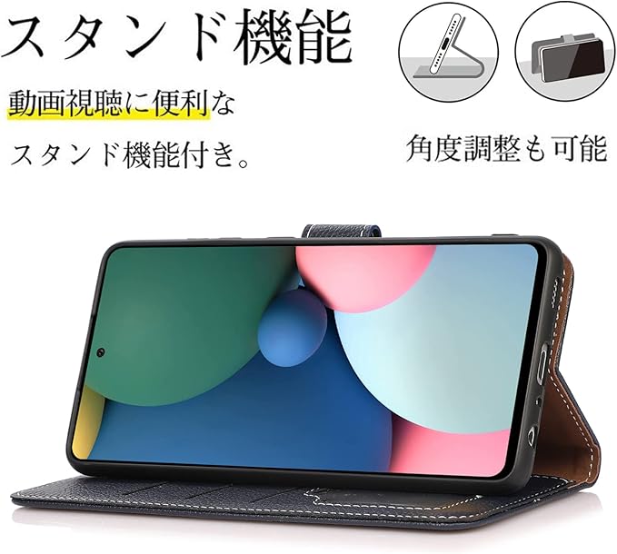 スマホを横置きできるスタンド機能が付属 ●背面カバーが折れ曲がる設計となっているため、スマホスタンドとしてもご利用可能です。動画視聴やテレビ通話でご活用いただけます。角度調節も可能です。