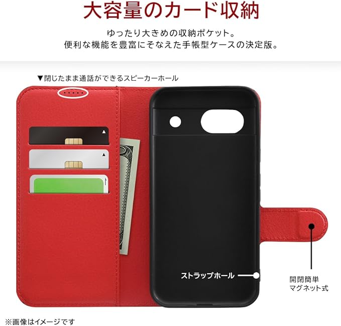 カードが入れられる大容量な収納ポケット。軽量で薄く持ち運びしやすい。動画視聴などに便利なスタンド機能付き。衝撃に強く、使いやすい。便利な機能を豊富にそなえた手帳型ケースの決定版。