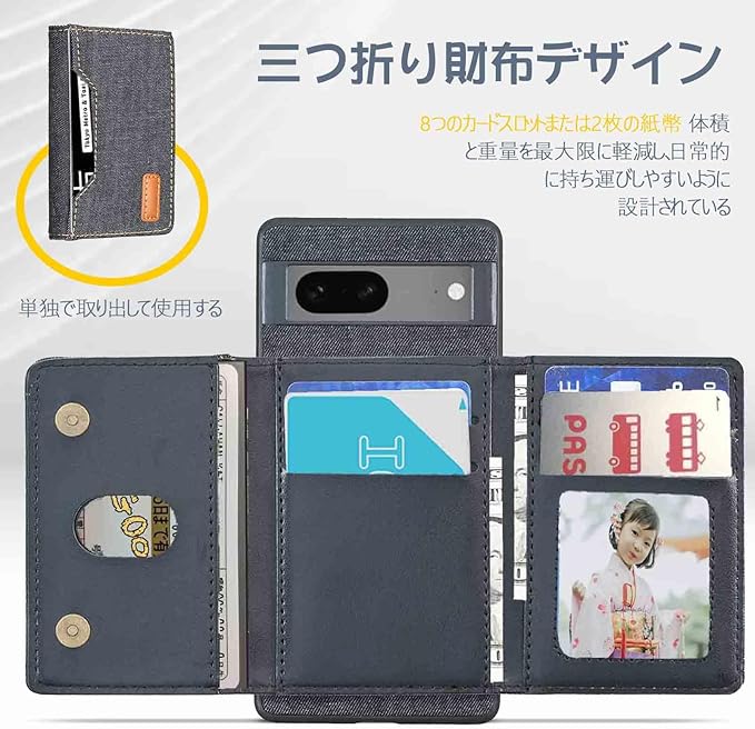 【Aqier】デニム財布ケース Google Pixel 6a au Softbank 分離式 両用 プレミアムデニム生地 電話ケース (ブラック) グーグル ピクセル6a マグネット式 取り外し可能 三つ折り 財布カード ホルダーポケット 付き縄掛け バックカバー グーグルpixel6a BLACK | KAZESHOP
