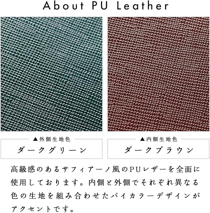 高級感のあるサフィアーノ風PUレザーを前面に使用しております。内側と外側で異なるカラーを使用しバイカラーとなっております。