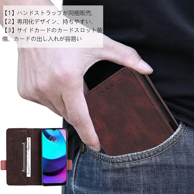 【ポイント②】:ハンドストラップ同梱販売、落下防止機能性が備えます。マグネット内蔵式の留め具でピタッと容易く閉まります。内部の柔軟なTPUホルダーは衝撃吸収の性能が抜群で、万が一の落下発生の時、大切なスマホ本体をしっかり守ることができます。