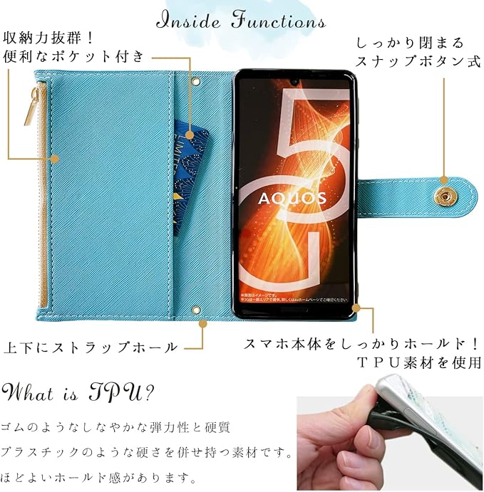 ◎手帳部分と内側ケース部分は接着しておりますが、強くめくったりひっぱると剥がれる場合がございます。内側のケースは黒TPUを使用し、本体をしっかりカバーします。電源ボタンや音量ボタンなどは、黒TPUケースの上から押す仕様となっております。カメラ部分などは機種に合わせた開口部が開いております。