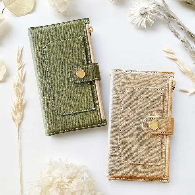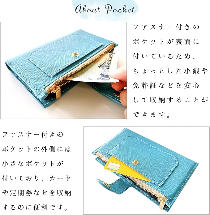 ケース全面には傷が付きにくく、デイリー使いのしやすいサフィアーノ 調 型押し PUレザーを使用。スナップボタン・ファスナーにはゴールドを、ファスナーのテープ部分にはベージュカラー使用し、アクセサリー感覚でもお持ちいただけるような、存在感・こなれ感のある手帳型ケースに仕上げました。