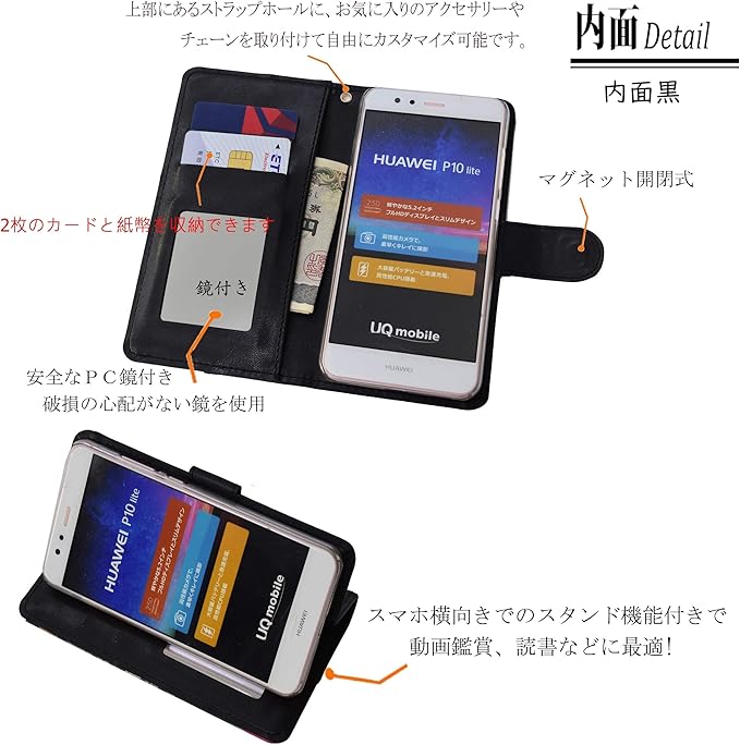 ★ケース特徴:マグネット開閉 ■カード収納あり■予備ストーン付き■動画鑑賞やデスクの上に置いて便利なスタンド機能、及びビジネスシーンや名刺など収納可能なカードホルダー付きです。一つ一つハンドメイドでストーンが取り付けられております。カメラ穴部分は機種ごとに開け、樹脂塗料にて仕上げてあります。留め具はマグネット式なので、力を入れずに楽に開閉ができます。ストラップ付きで持ち歩きに便利です !★ケースを装着したまま、電源ボタン、音量ボタン、コネクター等の機能が自由に使えます。