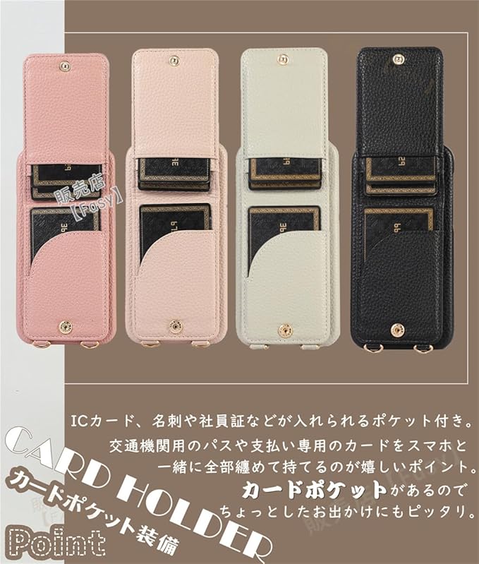 ● 定期やポイントカード収納に便利なカードポケット有。ICカードやポイントカードを入れれば通勤・通学にも便利♪ケースに長めのストラップがついたデザインは、ハンズフリーでスマートに持ち運びができます。普段使いから、ちょっとしたパーティーまで活躍してくれるパーティーアクセです。