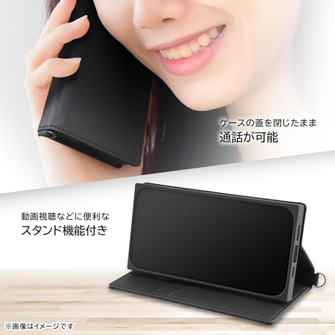 ケースの蓋を閉じたまま通話が可能。動画視聴などに便利なスタンド機能付き。ストラップホール Dリング付き。カードが入れられる大容量な収納ポケット。
