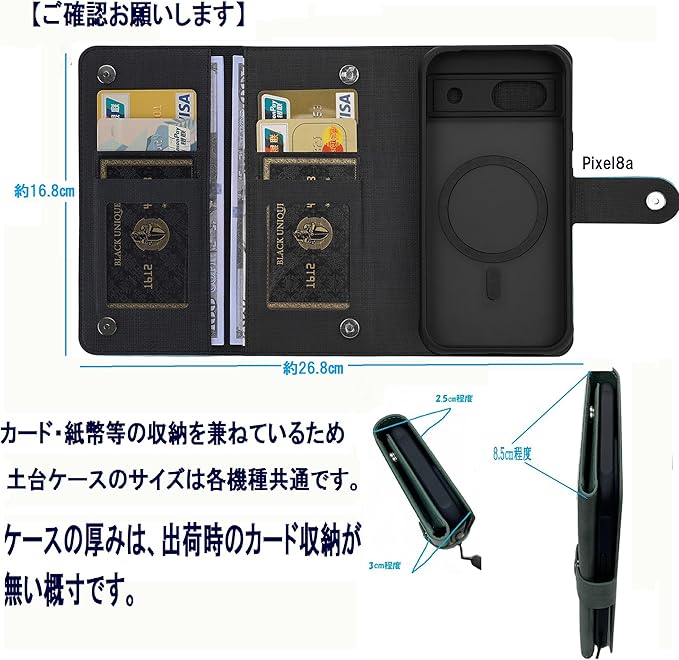 【サイズ】:お財布機能(紙幣)を兼ねているため、土台ケースよりお手持ちの機種サイズが小さい場合がございます。画像による説明を必ずご確認頂けますようお願い申し上げます。