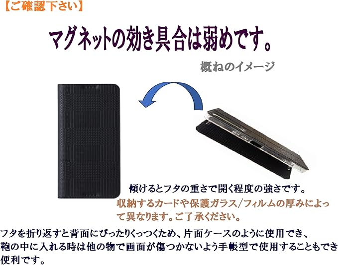 マグネットの効きは弱めです。ケースを傾けるとフタの重みで開く程度の磁力です。(機種本体に貼られた保護ガラス/フィルムや、カード収納の有無によっても異なります。