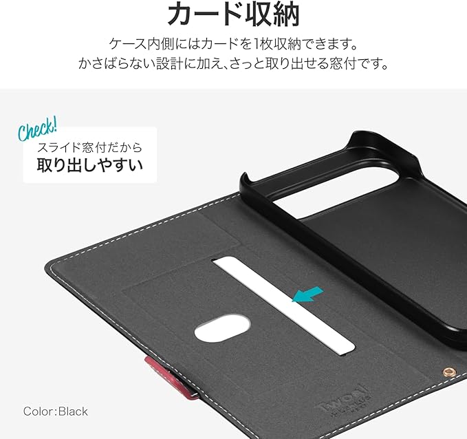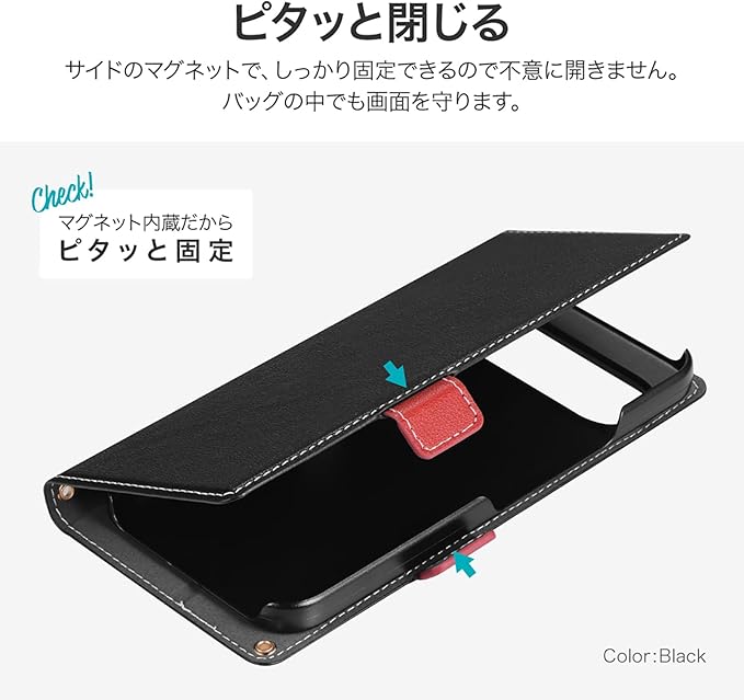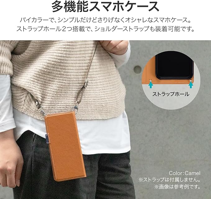 サイドベルトがバイカラーになった遊び心ある手帳型ケース/ピタッと固定できるマグネット仕様/すぐ取り出せて嵩張らないカード収納ポケット(1枚)/動画視聴に最適なスタンド機能/ショルダーストラップが使える2つのホール搭載