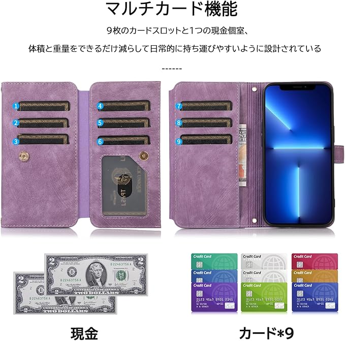 【収納力抜群】 :便利なカードポケットがついているから、ケースの中にはカードを9枚収納できるカードポ、紙幣など収納できるポケットがあります。ファスナーポケットも付きて、月票、現金、名刺、ICカード、Dカード、や運転免許証、交通カード、クレジットカード、などが収納でき、イヤホンなども、カードを持ち運びしカードスロット設計のビジネスウォレットはシンプルで便利