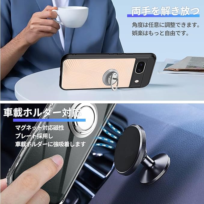 【スタンド機能 & 車載ホルダー対応】後ろに付いているフィンガーリングはスタンド機能はもちろん、滑りにくくて持ちやすい、安定的なグリップが特徴です。リングはケースにしっかり固定されていて、縦置き、横置きどんな角度でも固定できます。360度回転可能、180角度調節可能、携帯電話でビデオを見るのはとても便利です