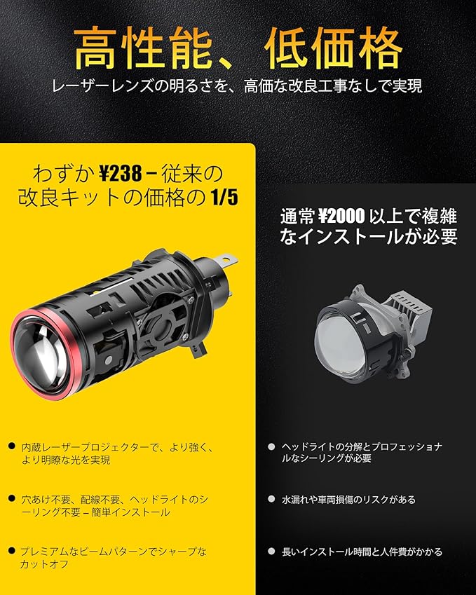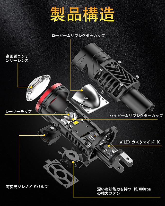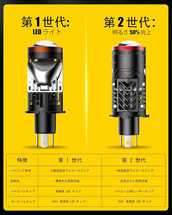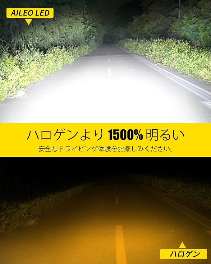 主な仕様光束(ルーメン):1セットあたり20,000LM(1個あたり10,000LM)で、圧倒的な明るさを実現。モデル詳細:AILEO 第2世代 H4 LED ヘッドライトバルブ。内蔵レーザープロジェクター搭載で、Hi/Lo切替可能、シャープなカットオフラインとプレミアムビームパターンを実現。右ハンドル車対応。※第1世代と比べて明るさは50%向上。色温度:昼光を模した明るい6000Kホワイト光で視認性向上。材質:一体型航空アルミボディ、AILEOカスタマイズIC搭載、15,000rpmの高性能ファンで優れた冷却性能。可変ライトソレノイドバルブ、高/低ビームリフレクターカップにより、第1世代よりも放熱性能を改善。動作電圧:DC 9–18V、12V車両システム対応。寿命:50,000時間以上の長寿命設計で、頻繁な交換の手間を削減。特徴視認性向上:高精細コンデンサーレンズとレーザーチップ(ハイビーム用レーザーチップ + 85ml高輝度LEDロービームチップ)搭載。光を効果的に集中させ、夜間走行も安心。ハロゲンランプ(射程100m)と比較して最大500mの照射距離、1550%明るくなります。簡単取付:プラグ&プレイで約10分のDIY取付が可能。穴あけや配線、ヘッドライトシールは不要。ハロゲンバルブをスプリングクリップで取り外し、LEDバルブをプロジェクターハウジングに差し込み、車両の純正ハーネスに接続するだけ。※装飾カバー内蔵のヘッドライトには非対応、標準プロジェクターヘッドライトに対応。同梱内容H4 レーザー LED ヘッドライトバルブ 2(プロジェクターレンズ付き)