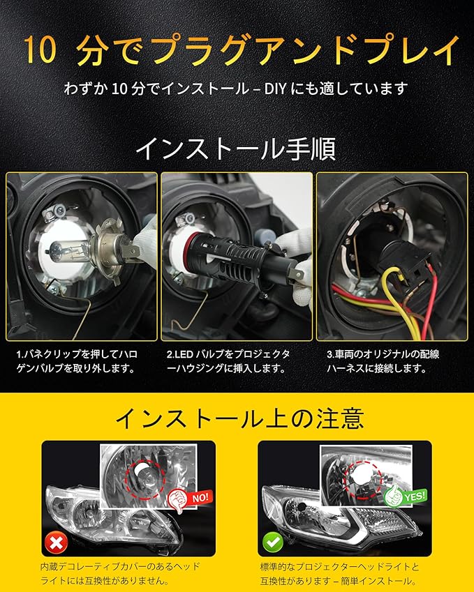簡単プラグ&プレイ取付 純正ハロゲンと同じ1:1サイズ設計の最新ブラックミニH4プロジェクターバルブは、加工不要で標準ハウジングにそのまま装着可能。穴あけやヘッドライト分解は不要で、ハロゲンを外してLEDを差し込み、純正カプラーに接続するだけ。約10分で簡単にDIY交換が可能です。