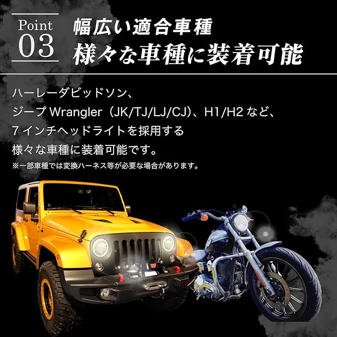 4. 幅広い適合車種:ハーレーダビッドソン、ジープWrangler(JK/TJ/LJ/CJ)、H1/H2など、7インチヘッドライトを採用する様々な車種に装着可能です。※一部車種では変換ハーネス等が必要な場合があります。