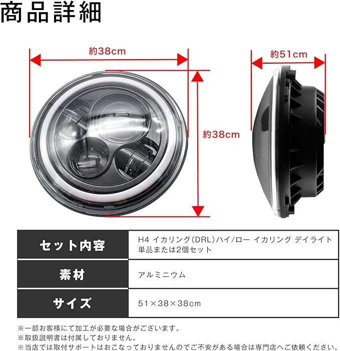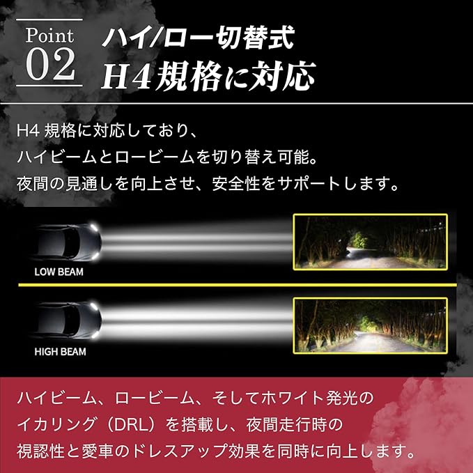 3. ハイ/ロー切替式 :H4規格に対応しており、ハイビームとロービームを切り替え可能。夜間の見通しを向上させ、安全性をサポートします。