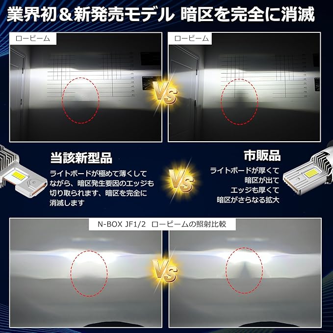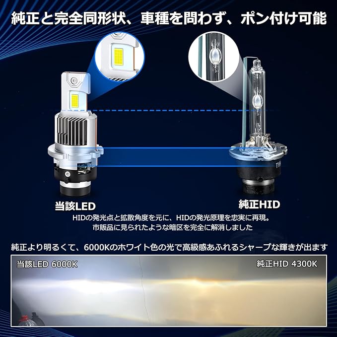 業界初、新発売モデル、暗区なしの D4S LED ヘッドライト 純正と同じな配光:当該製品は革新的なエッジで切り口を設計されており、暗区を完全に解消され、プロジェクター式のレンズで綺麗なカットラインが出て、暗区なし、新基準車検対応可能です。多くの市販品はライトボードが厚くて、エッジも厚くて、暗区がさらなる拡大で、走行中、どうしても気になる暗区が出ます。