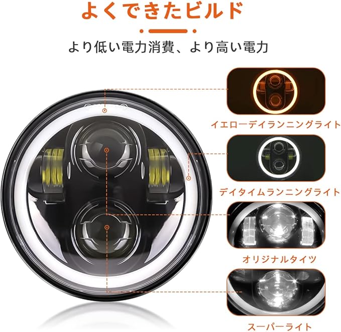 実際効率:40W HIGHビーム、30W LOWビーム ;電圧:DC10~100V;防水等級:IP67 ;カラー:ブラック