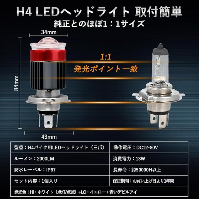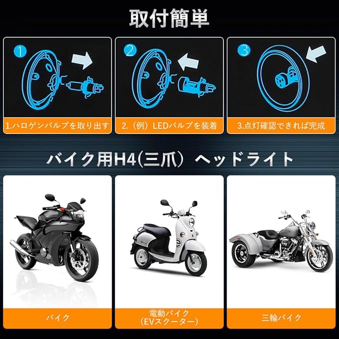 【高品質のH4LEDヘッドライト・多様な車種に対応】元のH4ハロゲンランプと同じサイズの設計を採用し、簡単な取り付けが可能です。モーターサイクルの既存の配線を交換する必要がなく、他の工具も必要ありません。さまざまな車種に適用されるH4ヘッドライトを搭載したバイク、電動車、スクーターなどに使用できます。ご購入前にランプハウジングの直径が2.2センチ以上であることを確認してください。