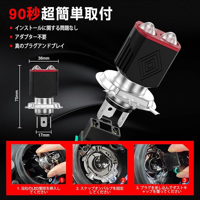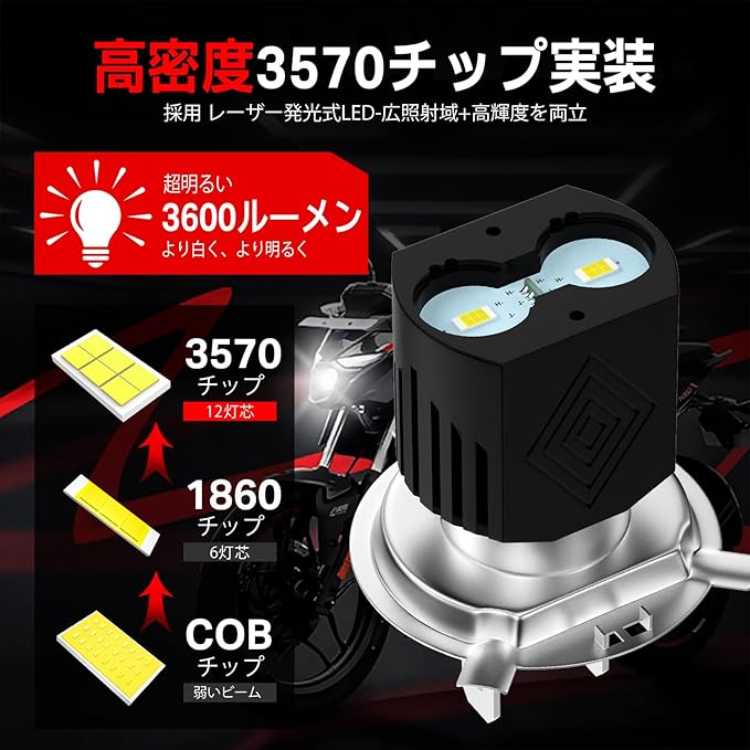 【ハロゲン電球からの完璧なアップグレード】当社のH4 LEDヘッドライトバルブは最大1200LMの明るさを実現し、6000Kキセノンホワイト色調です。上部に6個の高品質カスタム3570チップ、側面に60個の3030チップを搭載し、1個あたり最大25Wの出力で、伝統的なハロゲン電球より3倍明るく、真っ暗な夜をも切り裂くほどの明るさを誇ります。暗部や陰影が一切なく、夜間のバイク運転時により長い照射距離と広い視野を提供します。