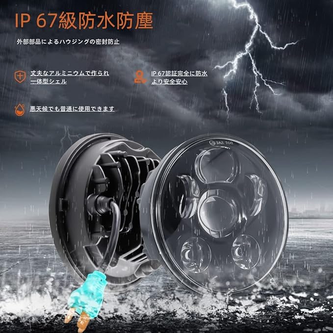 球切れの心配がなく、ハロゲンライトより明るく前方を照らします。使用電力が少ないので、ライトが点灯していてもバッテリーへの負担が小さくエンジン始動時も問題ありません。 IP67防水、低消費電力、高効率、省エネーと環境保護、防塵、抗爆発。