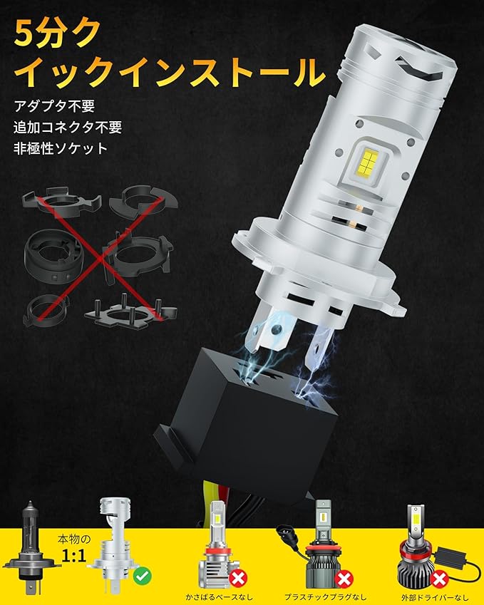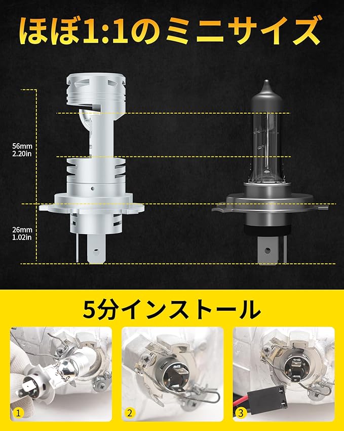 【迅速な熱放散】H4プロジェクションLEDヘッドライトは航空機用アルミニウム製ボディとユニークな中空ヒートシンクを採用し、熱放散効率を250%向上させ、バルブが50,000時間以上連続して光を放つことを保証します。最新のH4ミニプロジェクションレンズ付きLEDヘッドライトは、元のハロゲンサイズに完全に適合し、簡単に取り付けることができます。