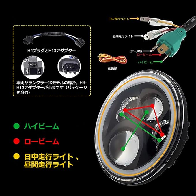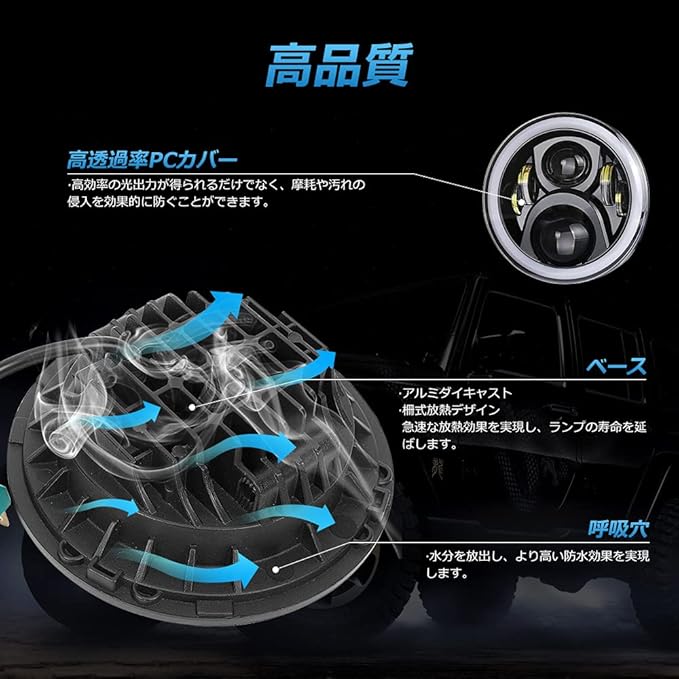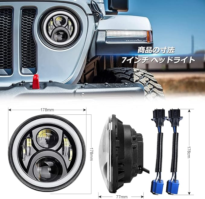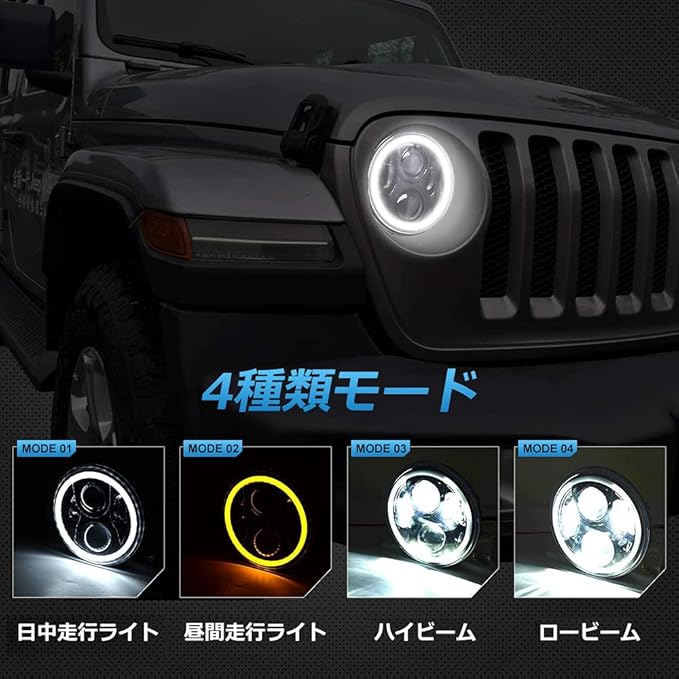 【適用車種】ジープラングラー、ジムニーなどの7インチヘッドライト装着車に適用します。ジープラングラーJK 2ドア(2007-2015)、ジープラングラーJK アンリミテッド4ドア (2007-2015)、ジープラングラーTJ/ LJ アンリミテッド (2003-2006)、ジープラングラーTJ (1997-2006)、ジムニーJA系、ハマー H1&H2(2003-2009)などなどに適用します。ご購入する前に、車種と型式を確認してください。