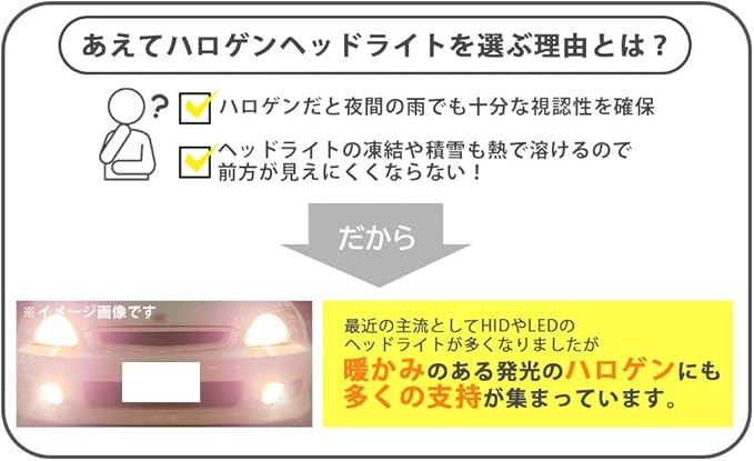 最近の主流としてHIDやLEDのヘッドライトが多くなりましたが、暖かみのある発光のハロゲンにも多くの支持が集まっています。夜間走行時雨天に遭遇した場合、HIDやLEDだと路面に光を反射させてしまい前が見づらくなる現象が起こります。ハロゲンだと夜間の雨でも十分な視認性を確保できますので、こちらを選ばれる方も多数います。