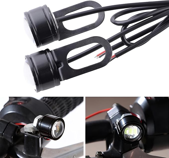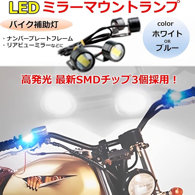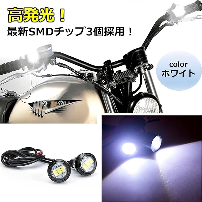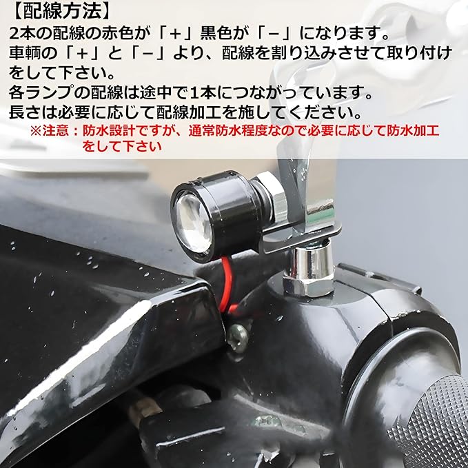 最新のSMDチップを3個採用! 高発光タイプのLEDなので、オートバイのバックミラー等に取り付ける事で、夜間の運転がより安全になります。 【配線方法】2本の配線の赤色が「+ 」黒色が「-」 になります。 車輌の「+」と「ー」より、配線を割り込みさせて取り付けて下さい。