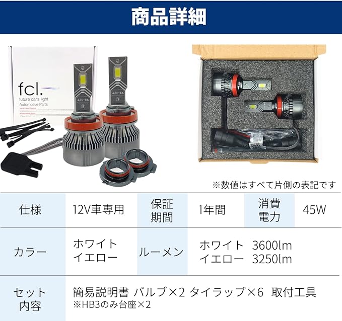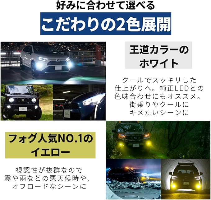 【選べる2つのカラーバリエーション】 用途やお好みに合わせて、スタイリッシュな「ホワイト(白)」と、悪天候に強い「イエロー(黄色)」の2色からお選びいただけます。ドレスアップや夜間の視認性重視ならホワイト、雨・霧・雪道での実用性重視ならイエローフォグがおすすめです。